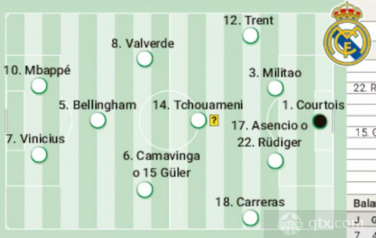 根据阿斯报的预测,皇家马德里本场比赛将会排出4-4-2的阵型。在门将位置上库尔图瓦将会首发,这名门将是球队在守门员位置上的首选,也是球队争取零封的关键。在后防线上,米利唐预计会与吕迪格或者劳尔阿森西奥进行搭档,而在边后卫位置上卡雷拉斯与阿诺德将会首发出战,这条后防线的整体实力还是很出色的,多名球员都有丰富的比赛经验以及不错的防守能力。在中场位置上,巴尔韦德、楚阿梅尼将会作为后腰出战,而另外一个后腰位置的球员将会在居莱尔与卡马文加之间选择,如果皇家马德里希望加强进攻可以选择居莱尔,如果希望稳定中场可以选择卡马文加,在前腰位置上贝林厄姆将会首发。在锋线位置上,姆巴佩与维尼修斯将会首发出战,姆巴佩在周中的欧冠上演大四喜,这名前锋状态出色对于皇家马德里来说是好消息,这两名前锋也将帮助皇家马德里保持出色的进攻能力,争取比赛的胜利。